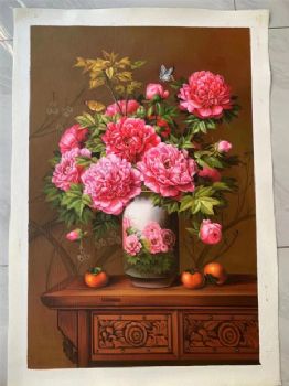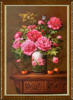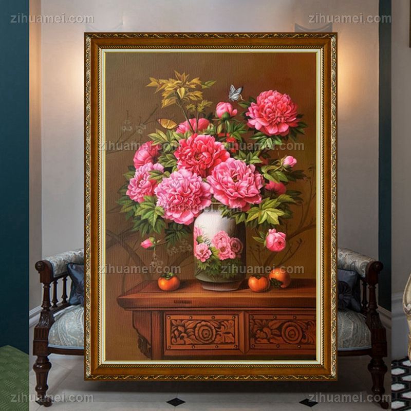 • 纯手绘精品写实花卉油画花开富贵瓶瓶安安牡丹油画实木画框