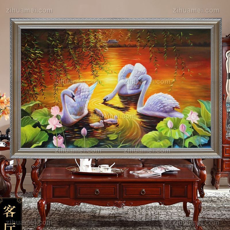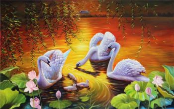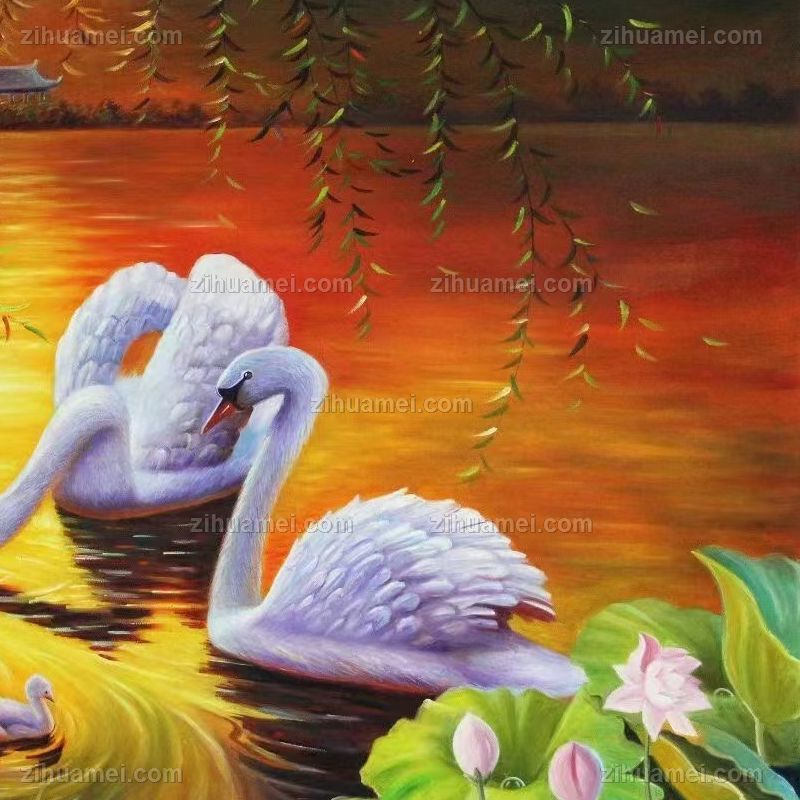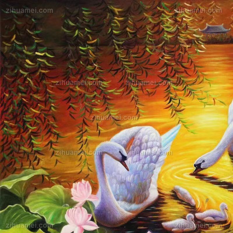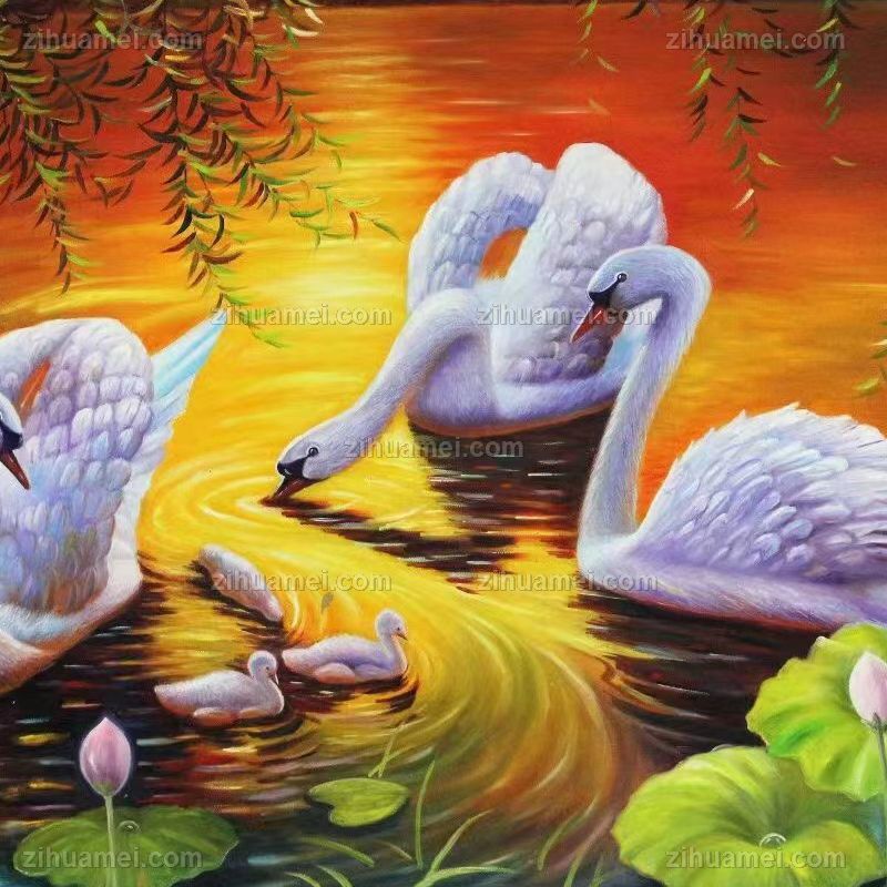 • 天鹅一家亲荷花池家大业大风景油画纯手绘油画