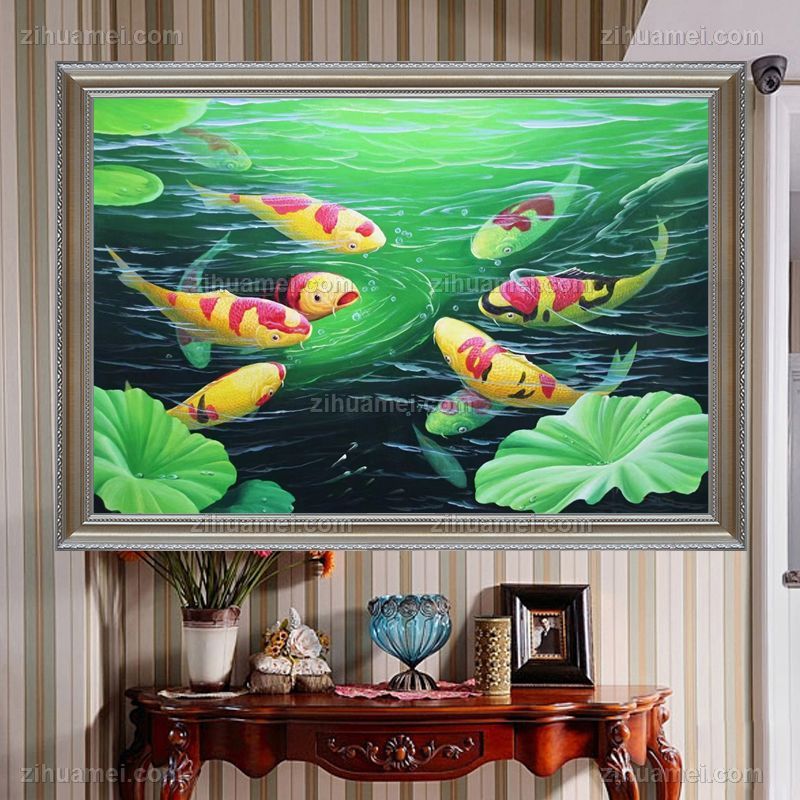 玄关九鱼图纯手绘写实锦鲤油画作品实木外框 手绘
