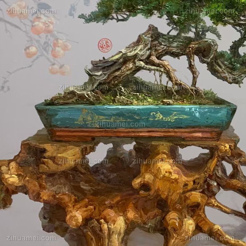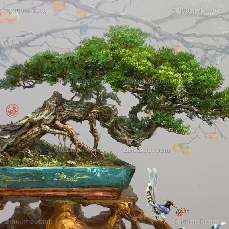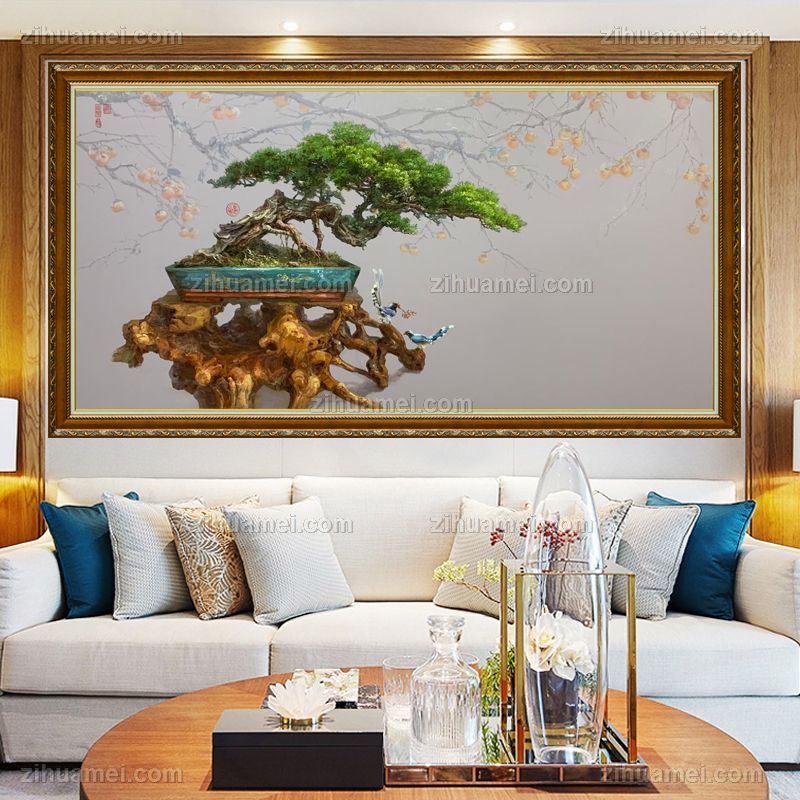 • 新中式客厅纯手绘油画绿枝盆景风景油画基叶长青年年益寿实木画框