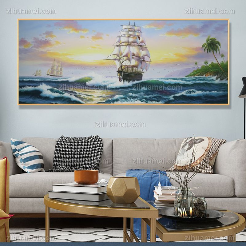 • 纯手绘海浪帆船风景油画一帆风顺客厅大厅挂画铝合金边框金色