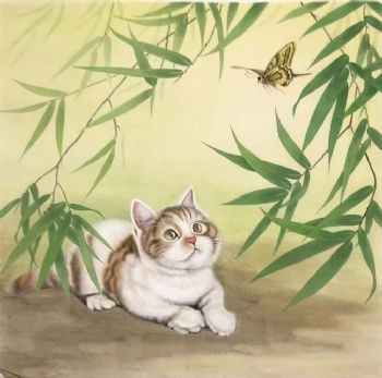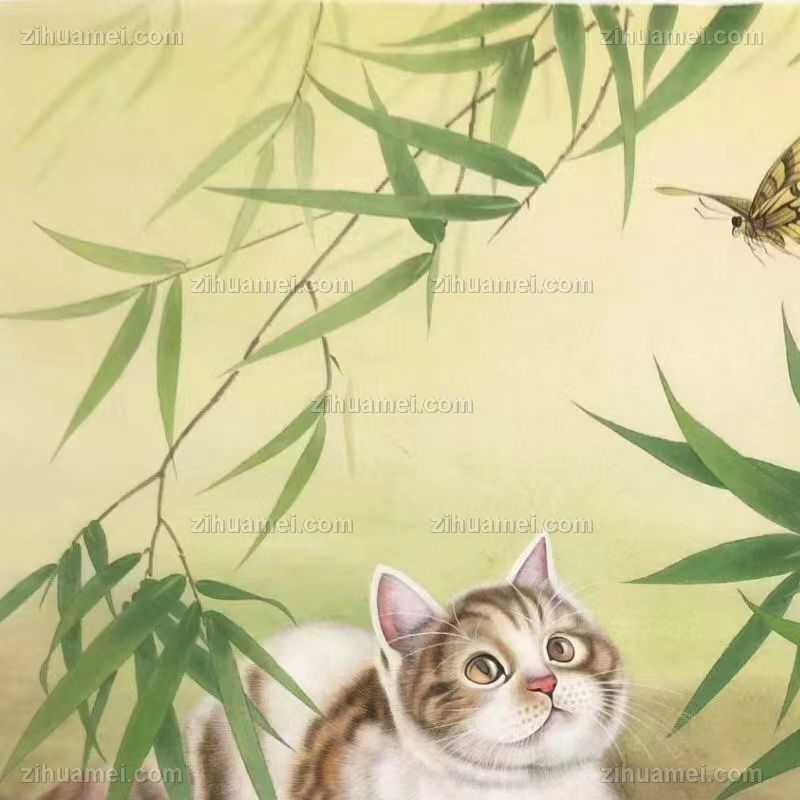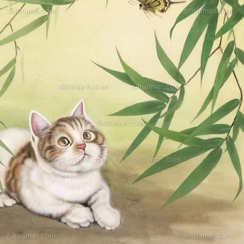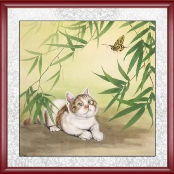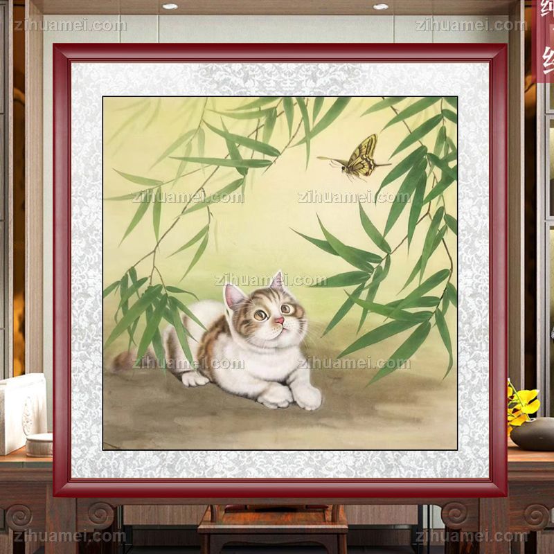 • 工笔手绘动物国画猫与蝶耄耋祝寿卧室挂画国画实木画框