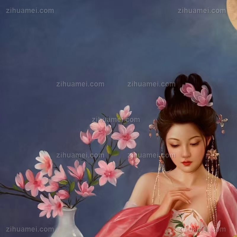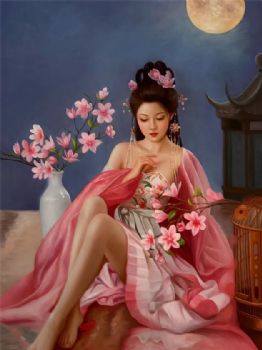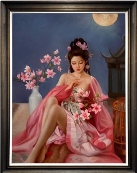 • 月光下的桃花美女图纯手绘中式人物油画美女油画