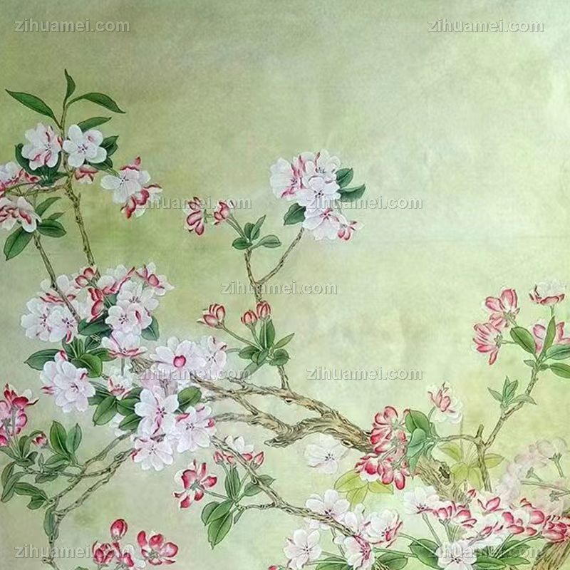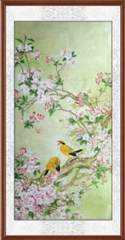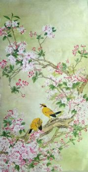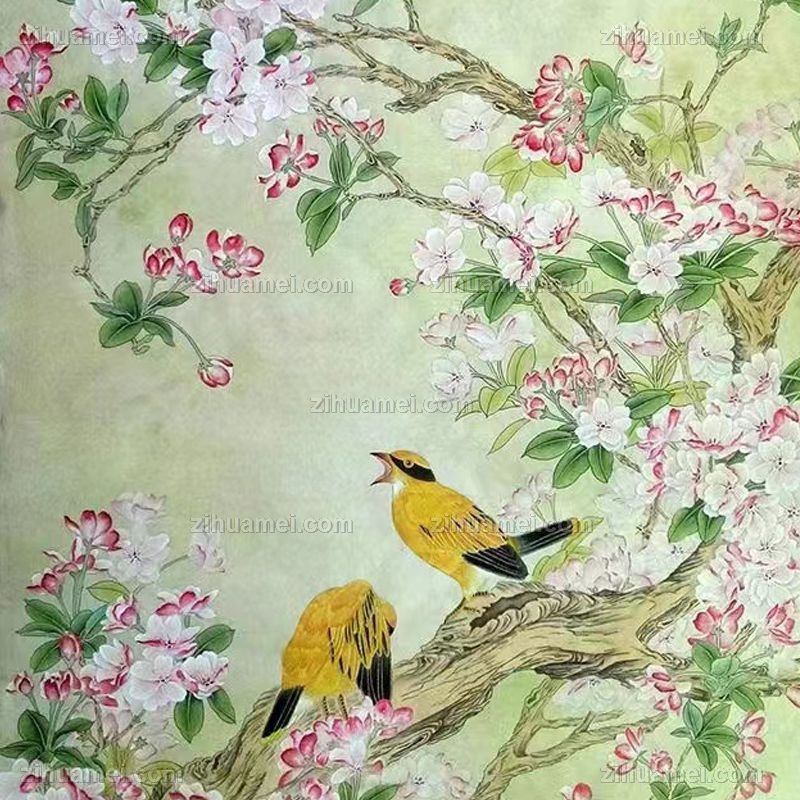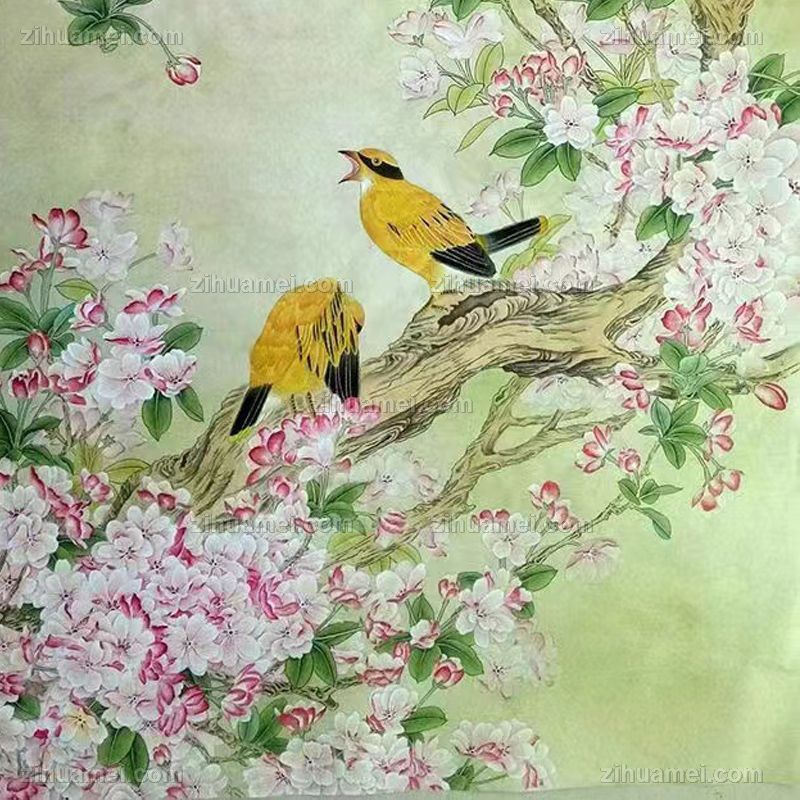• 纯手绘工笔海棠花与黄鹂鸟四尺竖幅国画