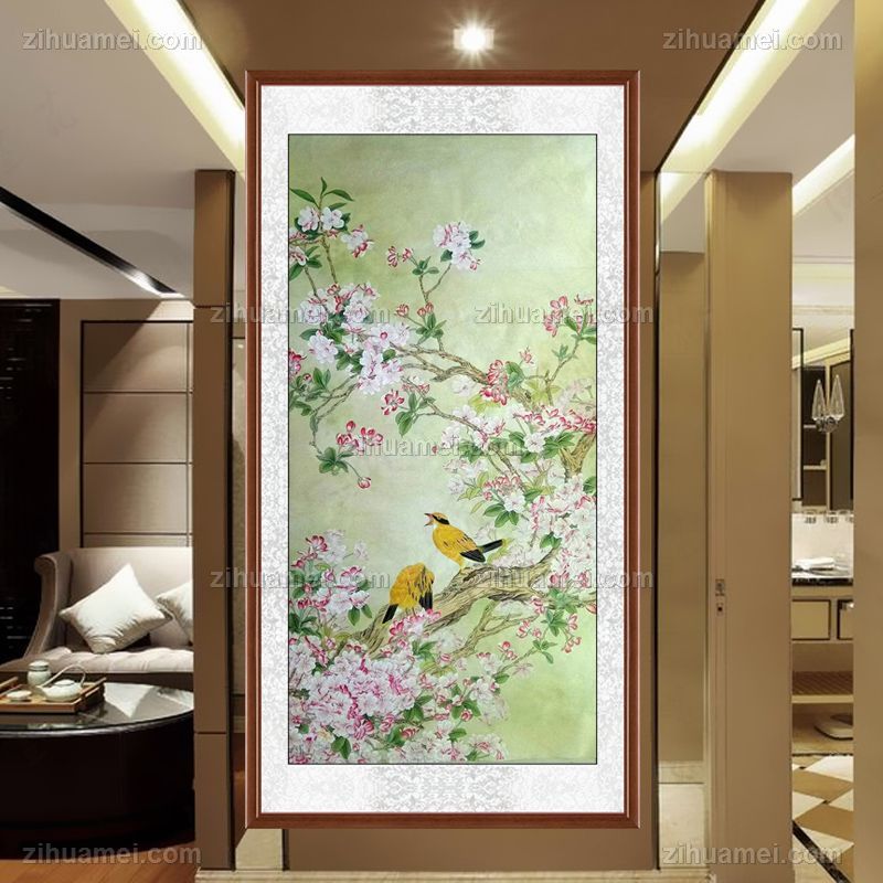 纯手绘工笔海棠花与黄鹂鸟四尺竖幅国画 手绘