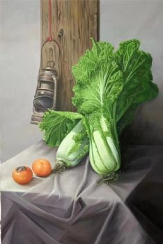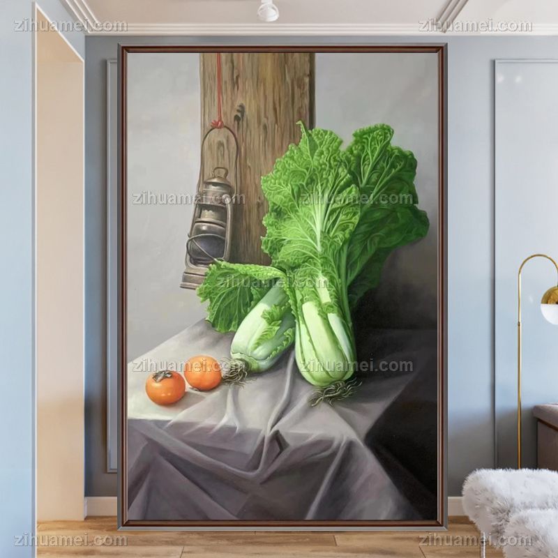 • 手绘写实静物油画白菜柿子马灯图发大财客厅大厅油画
