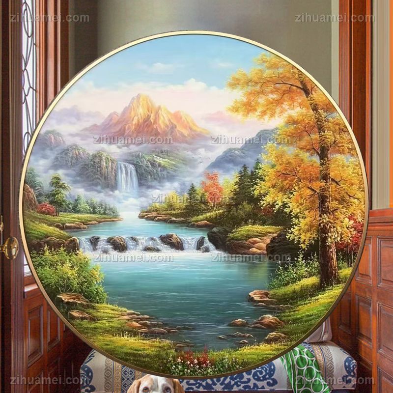 • 青山绿水圆形铝合金外框纯手绘油画金山聚宝盆山水风景