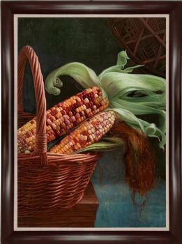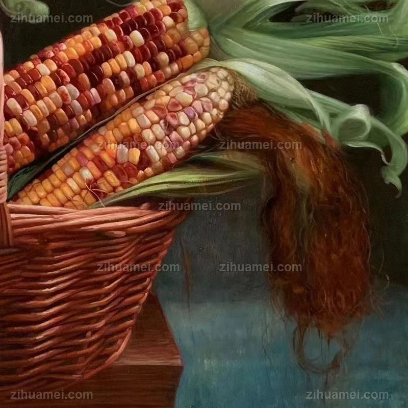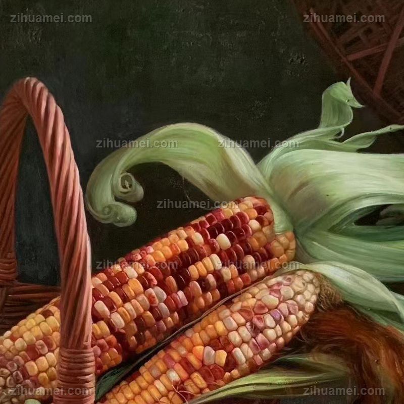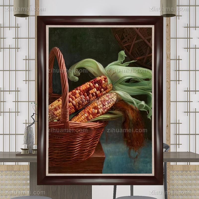 • 写实静物油画一筐玉米寓意多子多福中式玄关静物油画实木画框