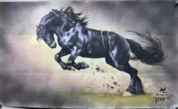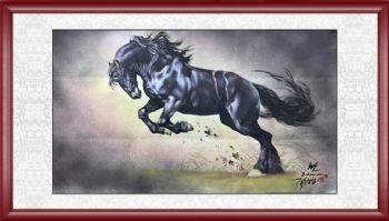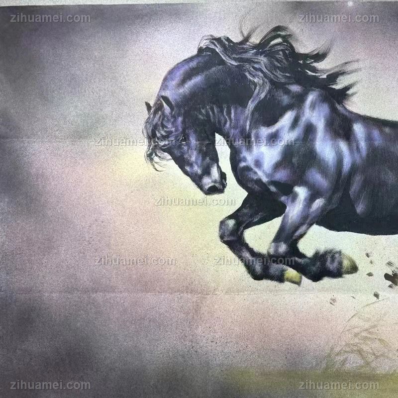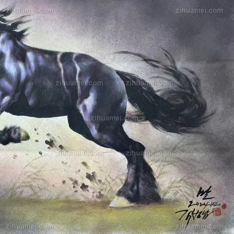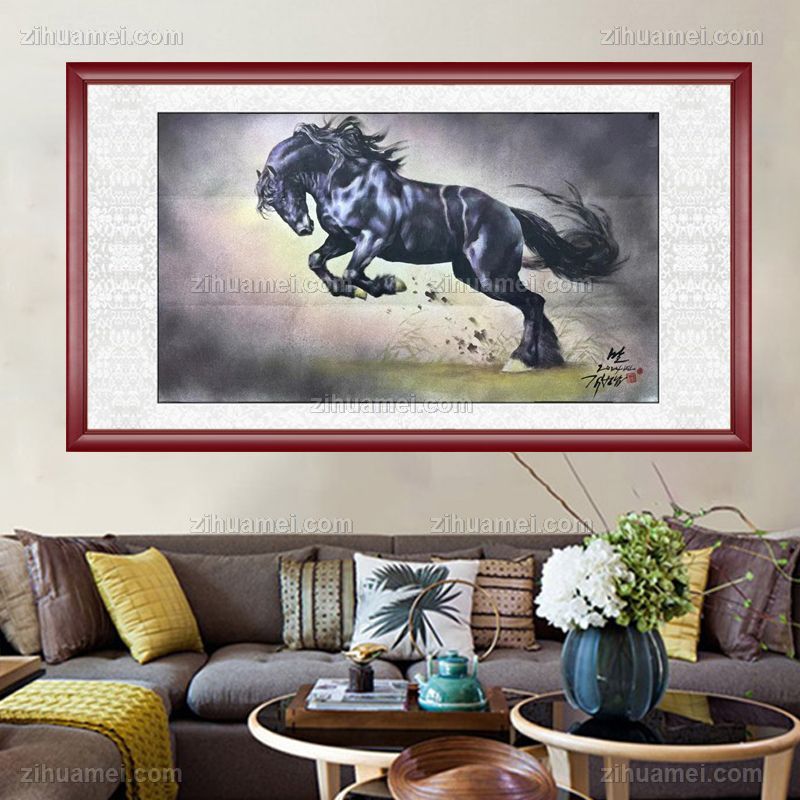 • 一匹黑马朝鲜国画水墨动物国画骏马图实木画框