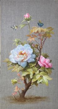 纯手绘竖幅精品牡丹油画写实花卉油画实木画框 手绘