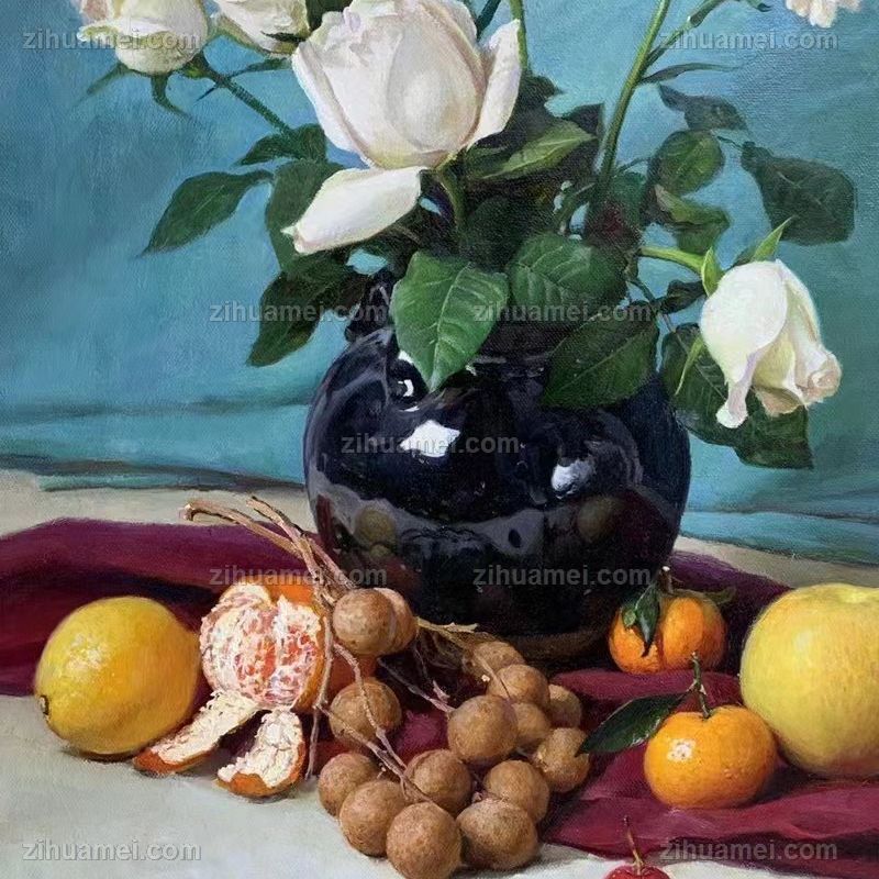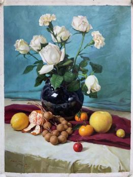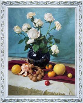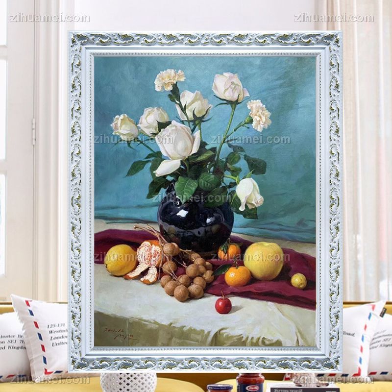 • 手绘朝鲜油画白玫瑰花瓶水果静物油画餐厅挂画实木画框
