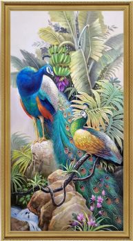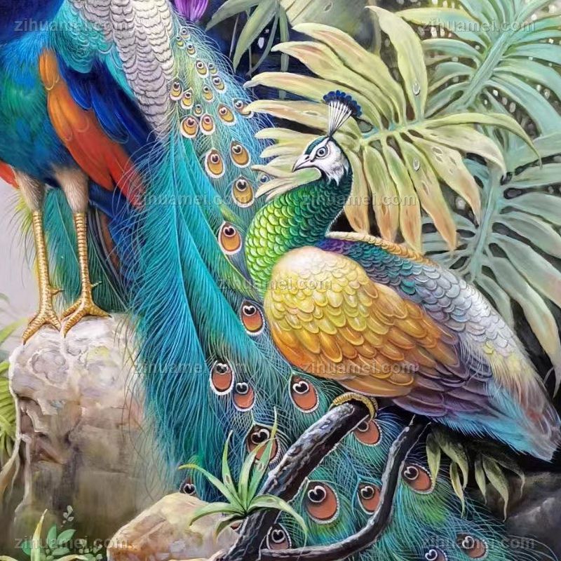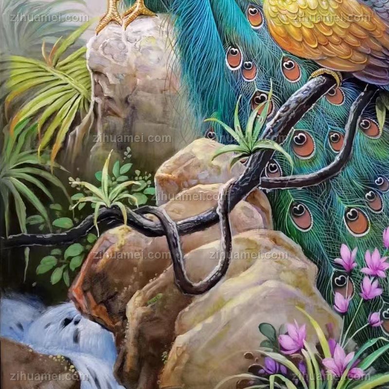 • 立在石头上的孔雀油画作品寓意时来运转手绘动物油画实木框