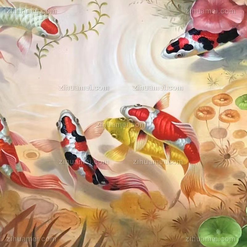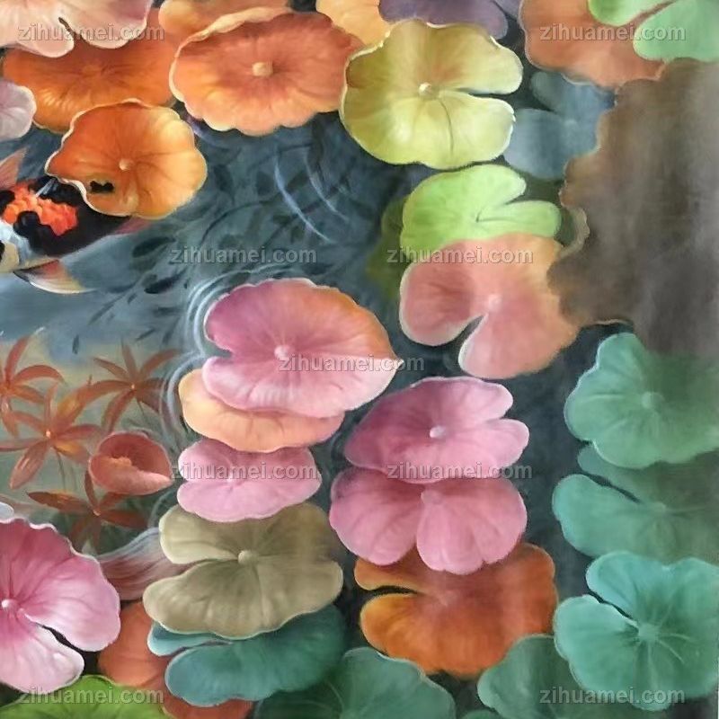 荷花池九鱼图纯手绘新中式客厅油画实木外框 手绘