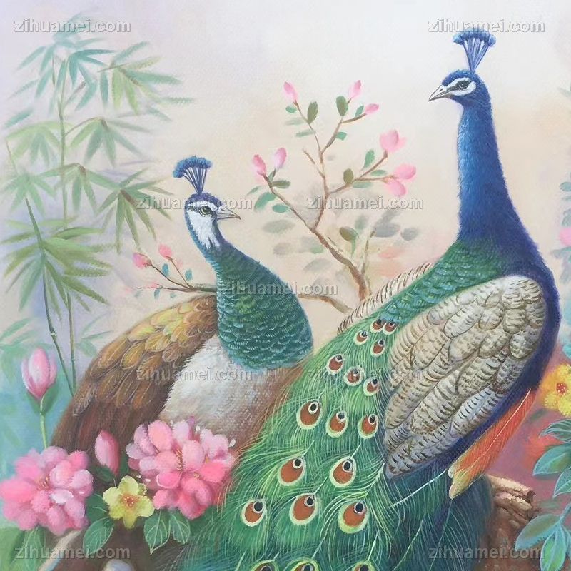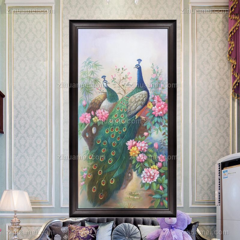 • 新中式动物油画孔雀写实油画纯手绘中式玄关油画