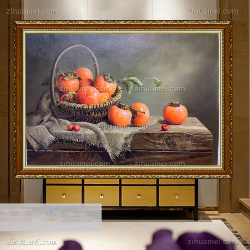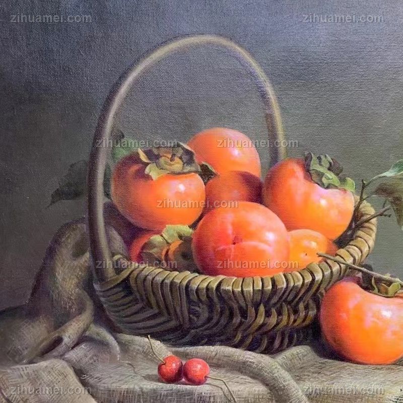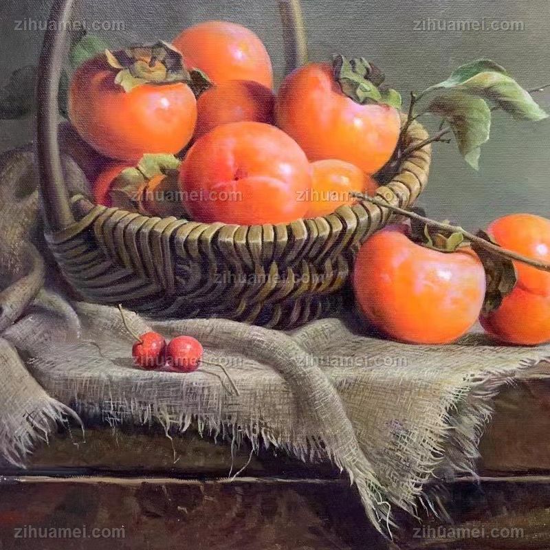 写实静物手绘油画好柿一箩框柿子图事事如意 手绘