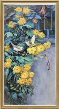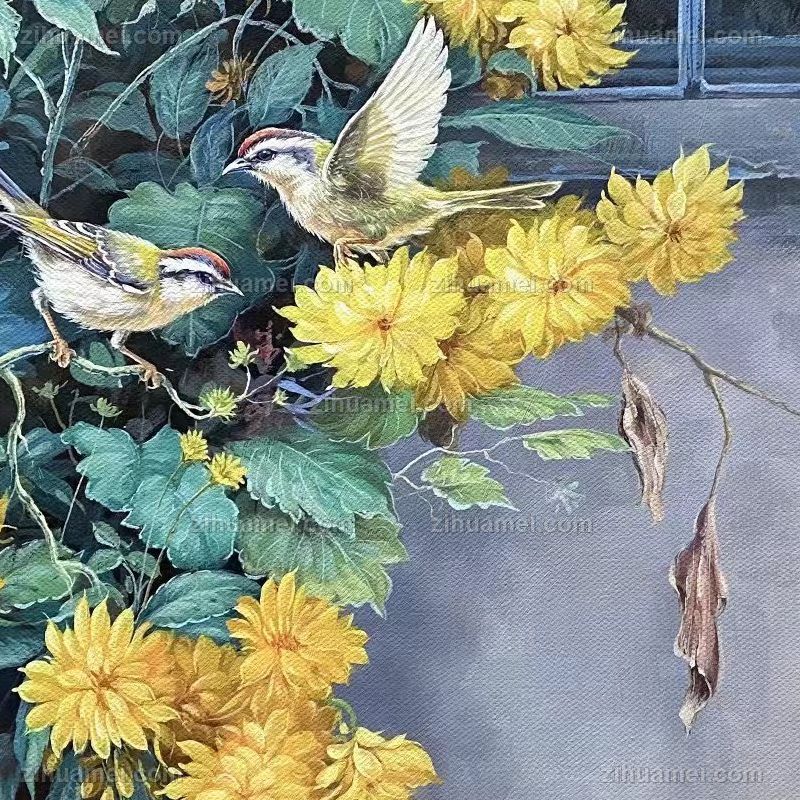 • 手绘风景油画屋檐下的两只小麻雀实木外框