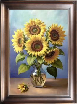 • 写实油画作品向日葵向阳花纯手绘油画花瓶实木外框