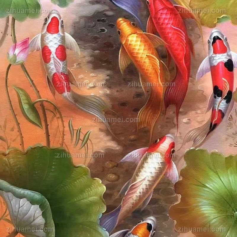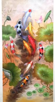 • 新中式锦鲤九鱼图油画作品