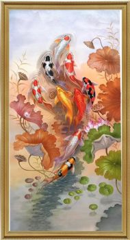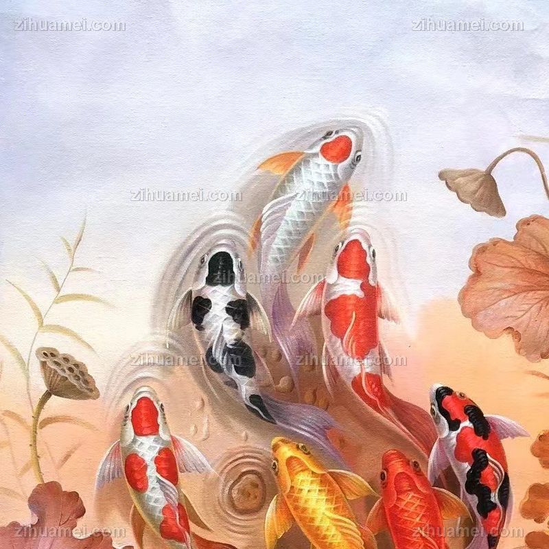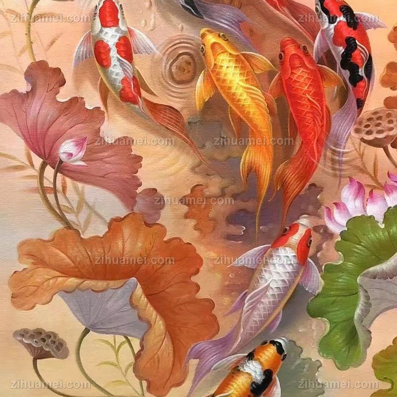 • 新中式写实油画作品九鱼图年年有余锦鲤玄关餐厅挂画实木外框