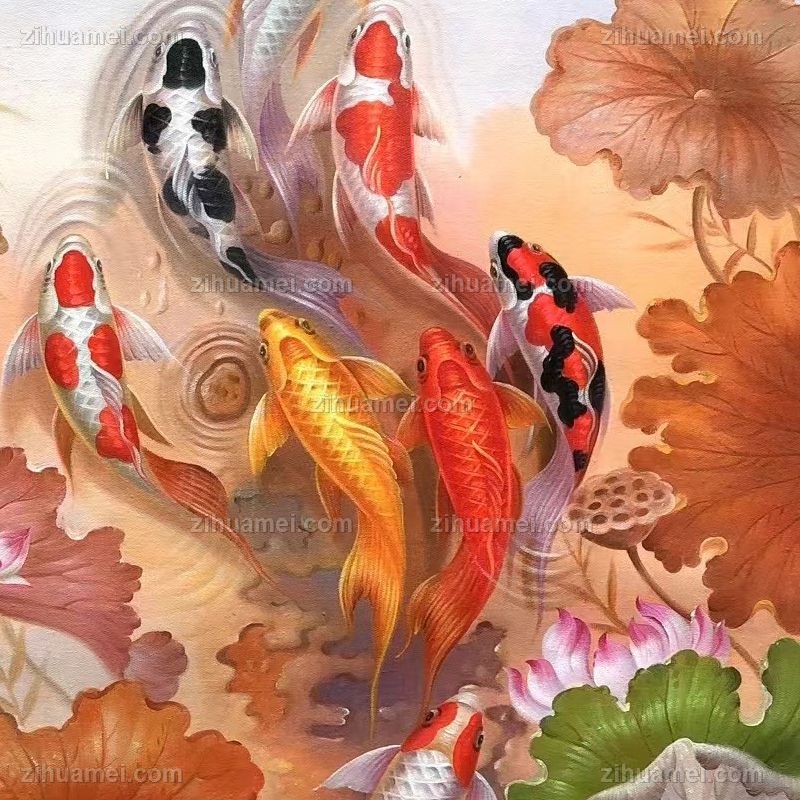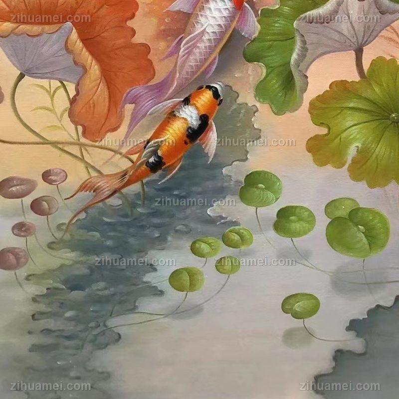 新中式年年有余锦鲤图纯手绘玄关荷花风景油画 手绘