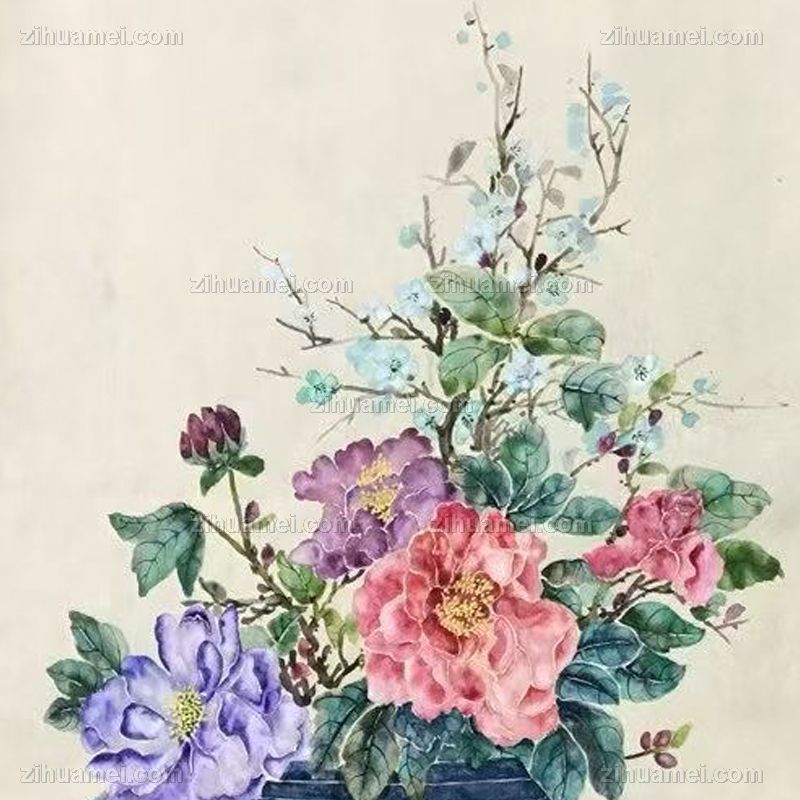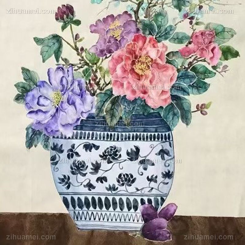 桌子上的花卉花瓶中式水墨国画没骨花卉作品 手绘
