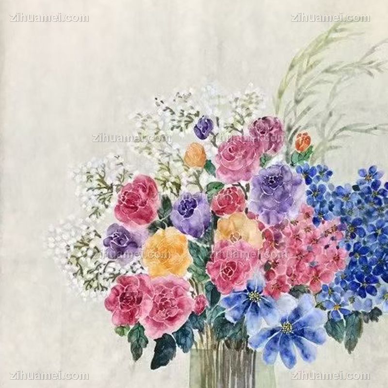 桌子上的花卉花瓶中式水墨国画没骨花卉作品 手绘