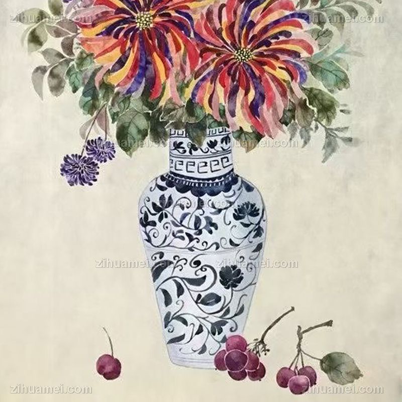 桌子上的花卉花瓶中式水墨国画没骨花卉作品 手绘