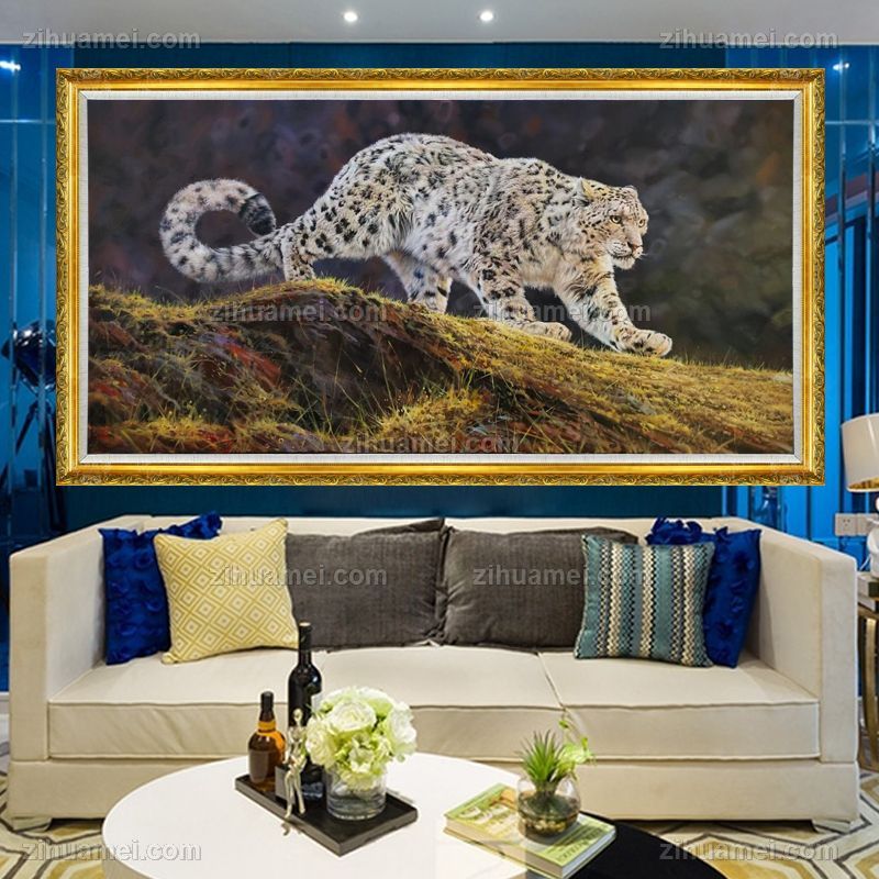 • 精品动物油画纯手绘雪豹写实油画动物办公室挂画实木外框