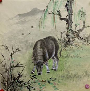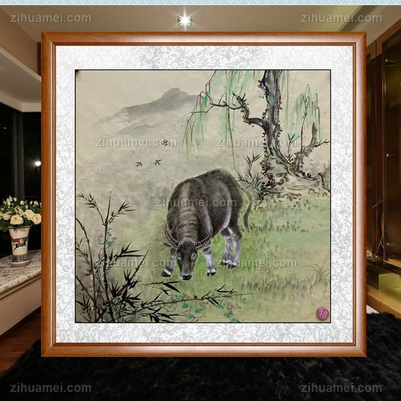• 四尺斗方国画动物国画纯手绘餐厅客厅牛写实国画实木外框