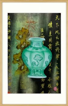 • 玉石风格纯手绘国画花卉花瓶写实在餐厅挂画原木色外框