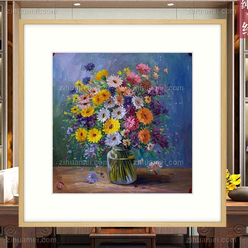 • 纯手绘彩墨国画静物小菊花花卉作品餐厅挂画实木外框