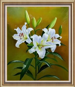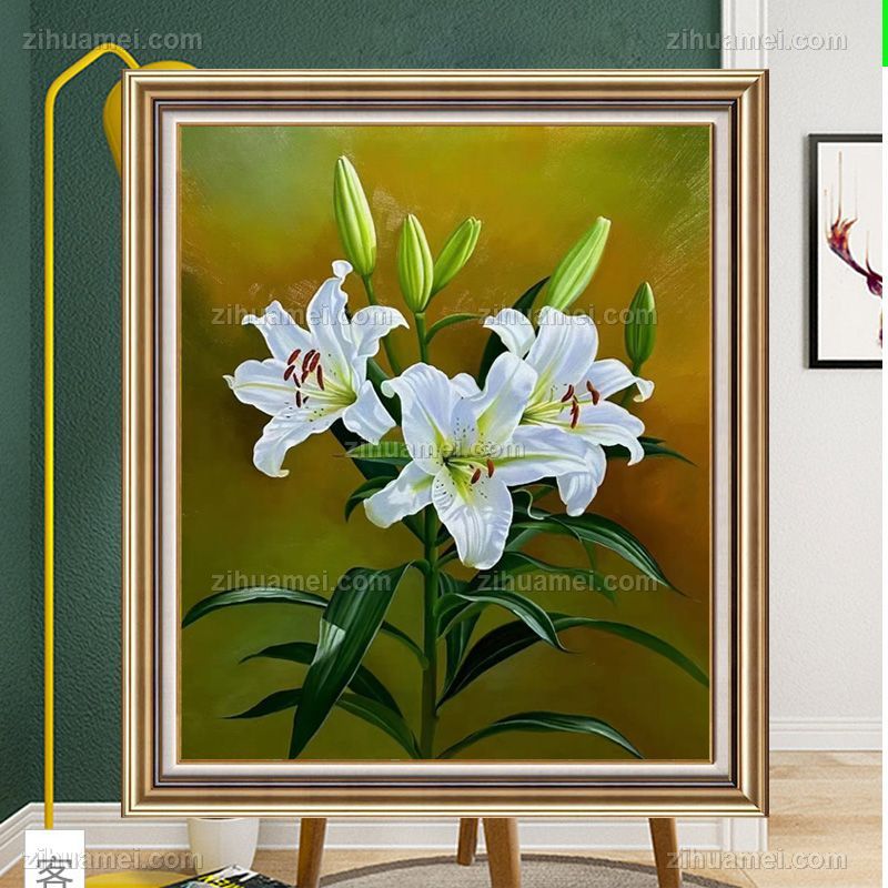 • 收藏精品花卉油画百合花纯手绘花卉油画作品餐厅挂画实木画框