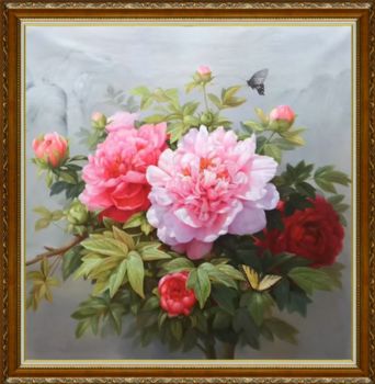 • 新中式花卉油画纯手绘牡丹写实油画花开富贵实木外框
