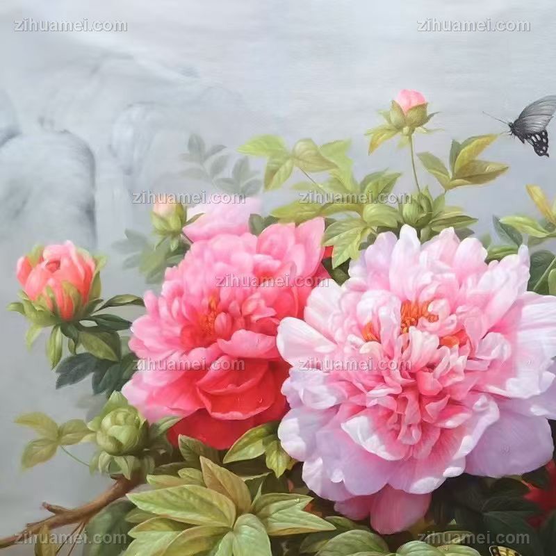 纯手绘竖幅精品牡丹油画写实花卉油画实木画框 手绘