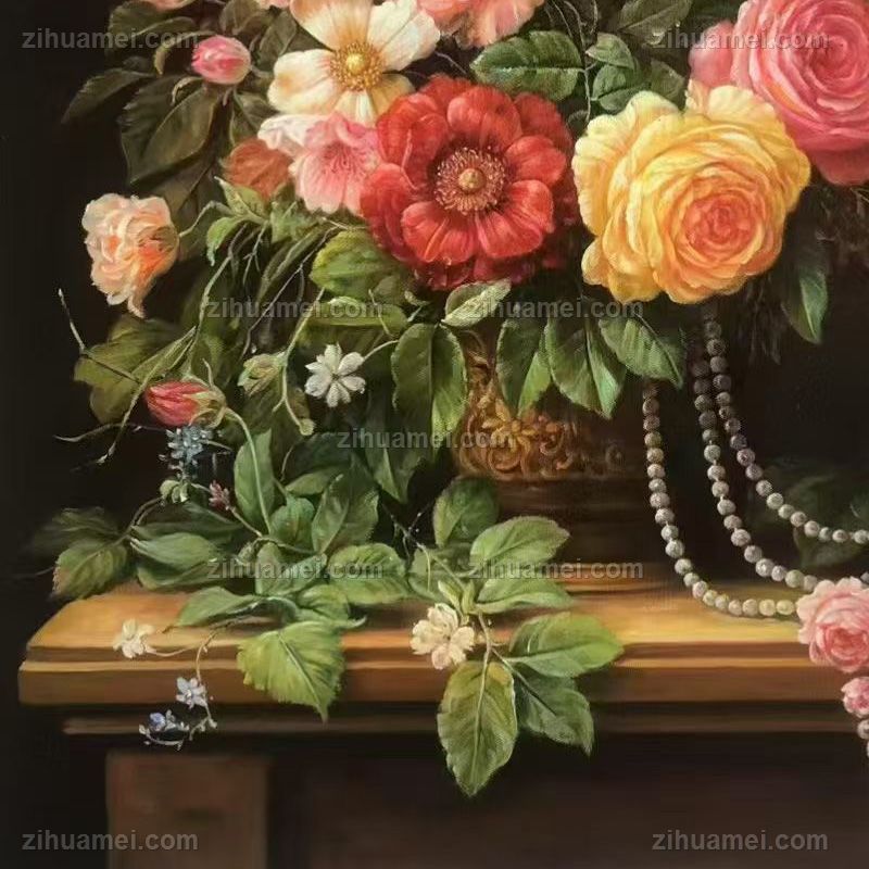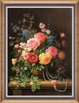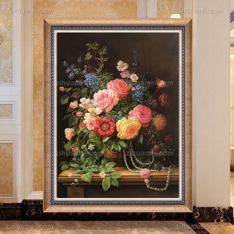 • 收藏精品纯手绘欧式花卉油画珍珠与花朵餐厅挂画实木外框