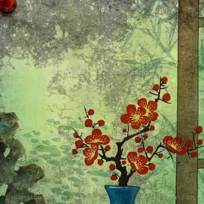 • 纯手绘彩墨新中式花卉梅花花瓶国画平平安安花开富贵原木色外框