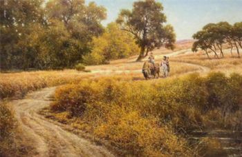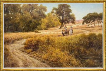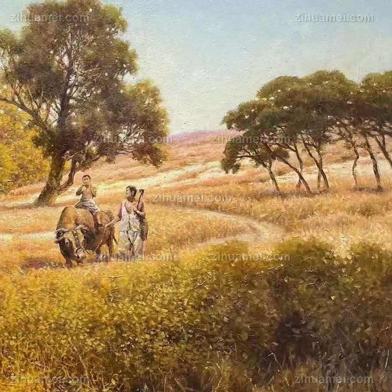 • 朝鲜油画纯手绘秋季自然风景骑牛的小孩油画客厅油画实木外框