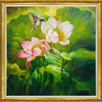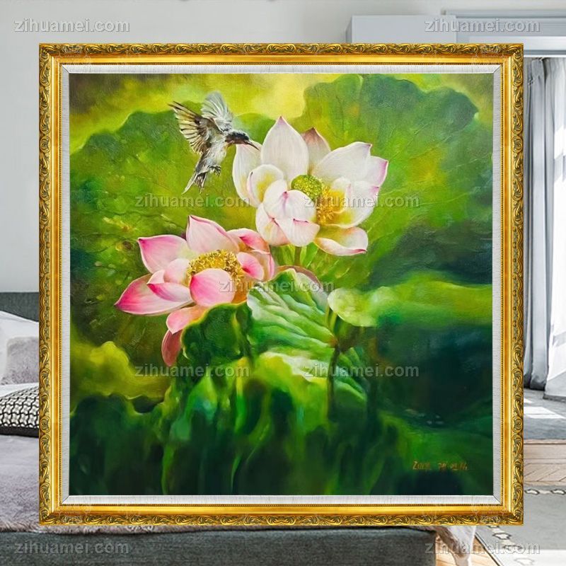 • 写实荷花风景油画纯手绘朝鲜荷花池风景油画客厅装饰挂画