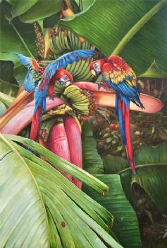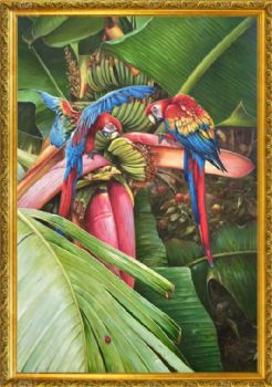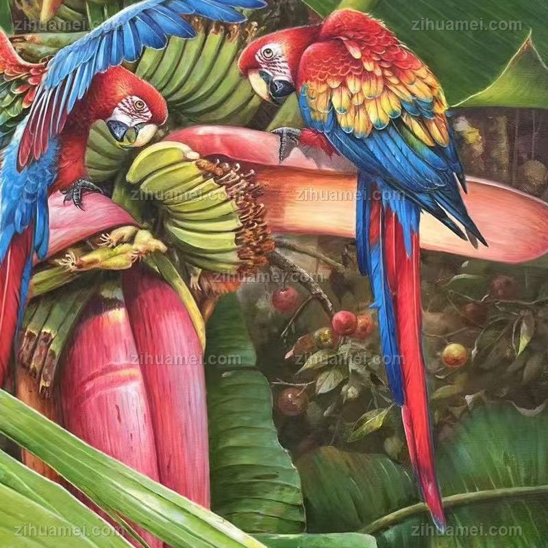 • 香蕉树上的金钢鹦鹉纯手绘写实动物油画实木外框