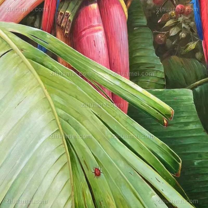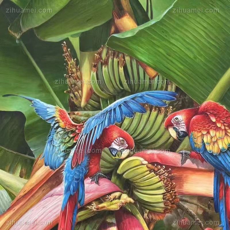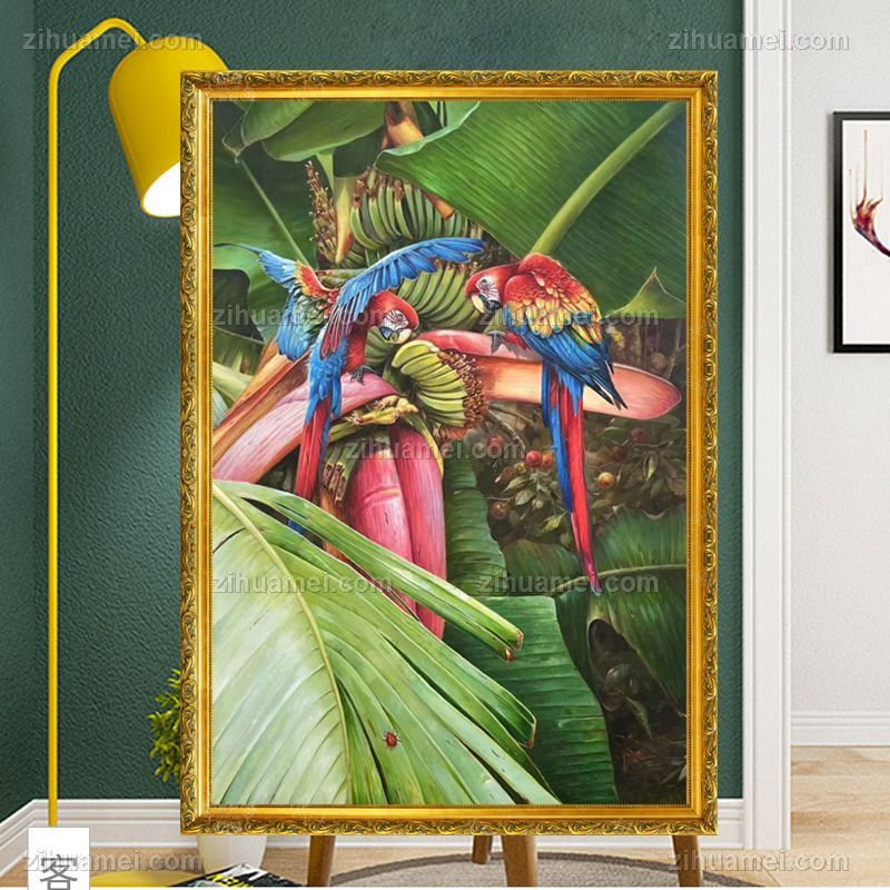 香蕉树上的金钢鹦鹉纯手绘写实动物油画实木外框 手绘