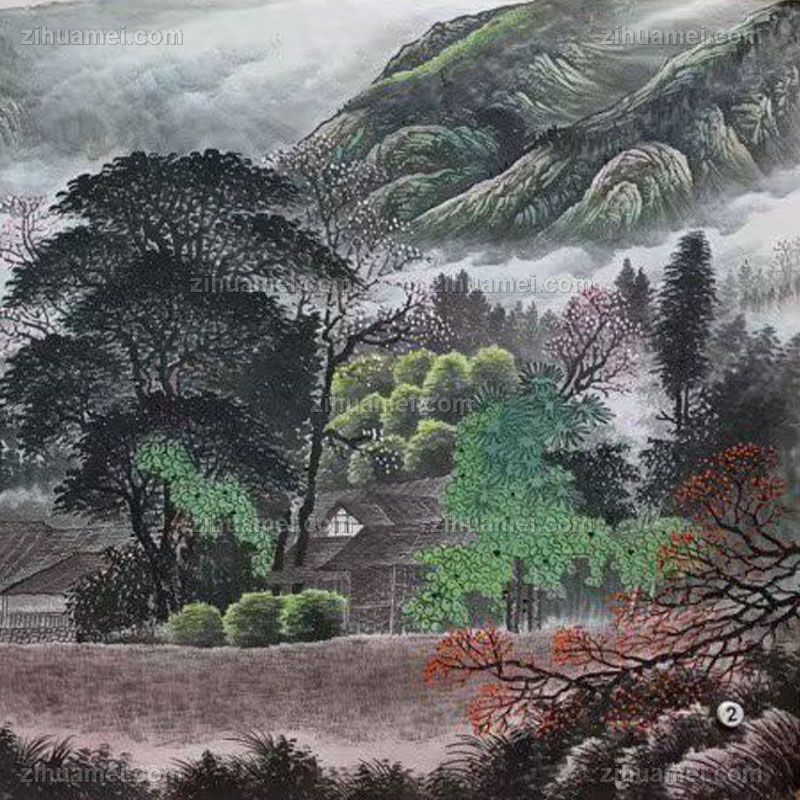 纯手绘彩墨四尺中式山水画工笔国画实木画框 手绘