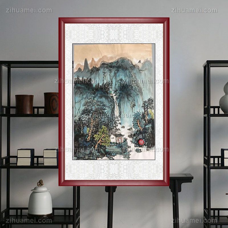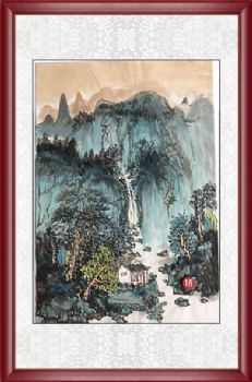 • 瀑布流水人家四尺三开山水国画纯手绘国画实木外框