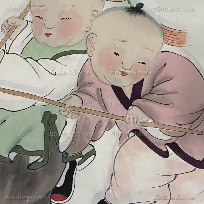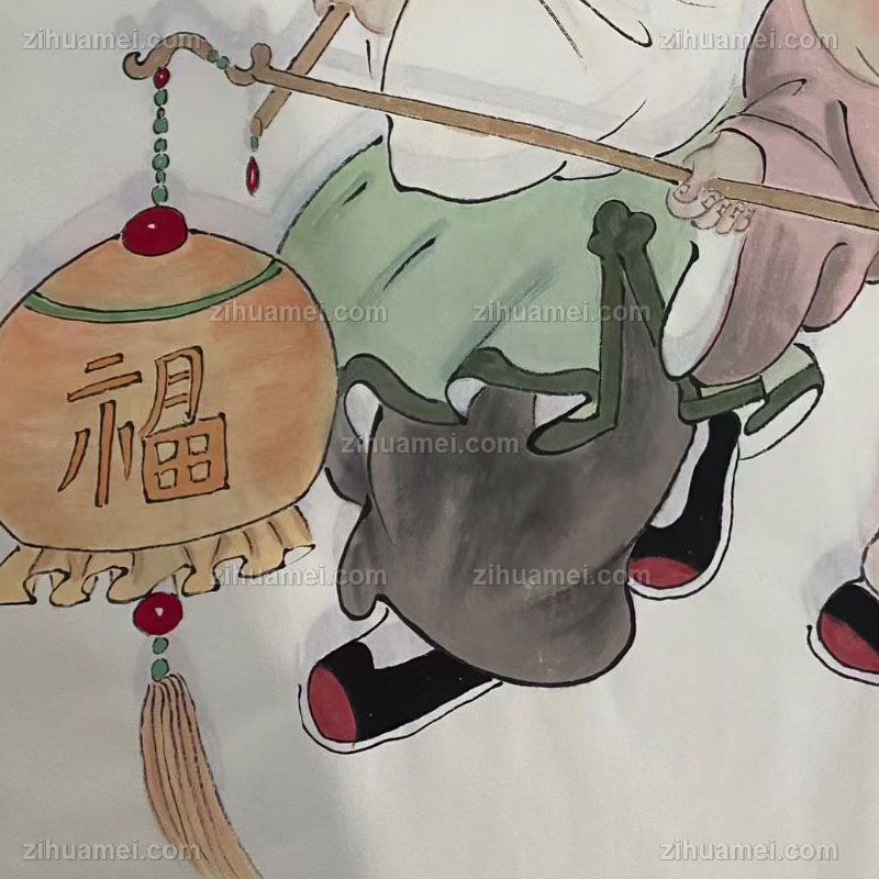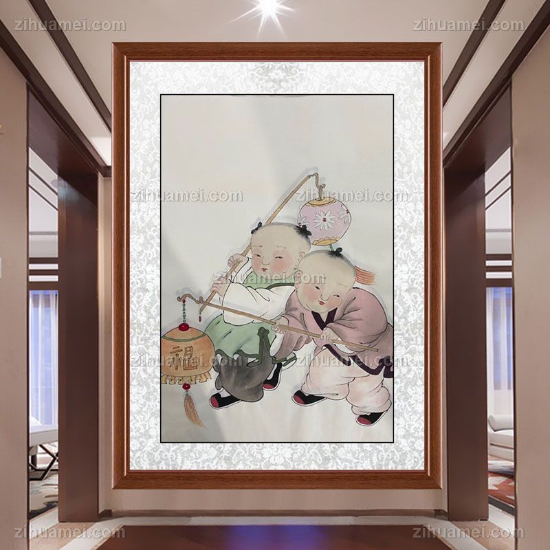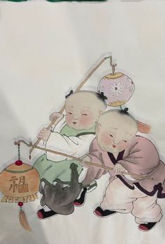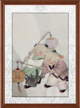 • 福娃戏灯笼图四尺三开人物人物国画纯手绘工笔人物画实木外框