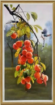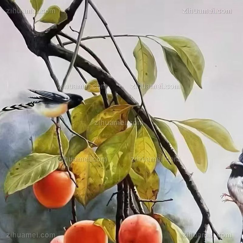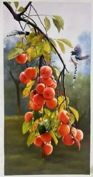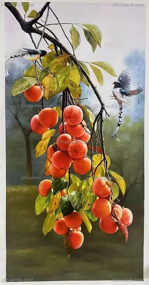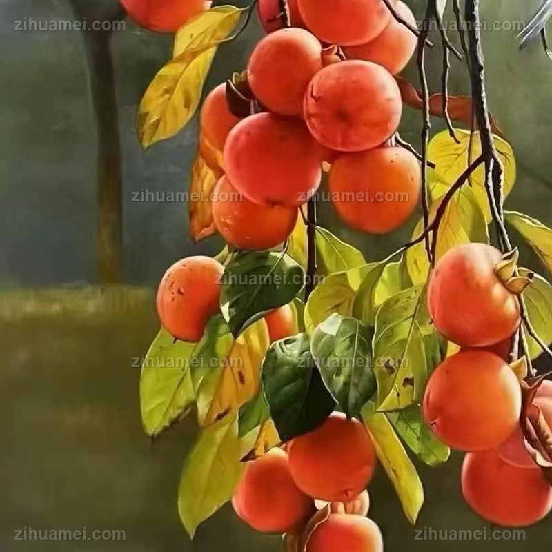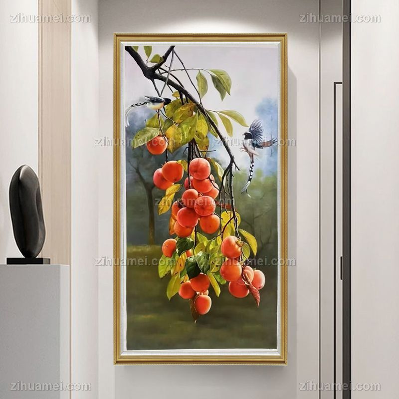 • 柿柿如意喜上枝头写实静物油画手绘柿子图实木外框