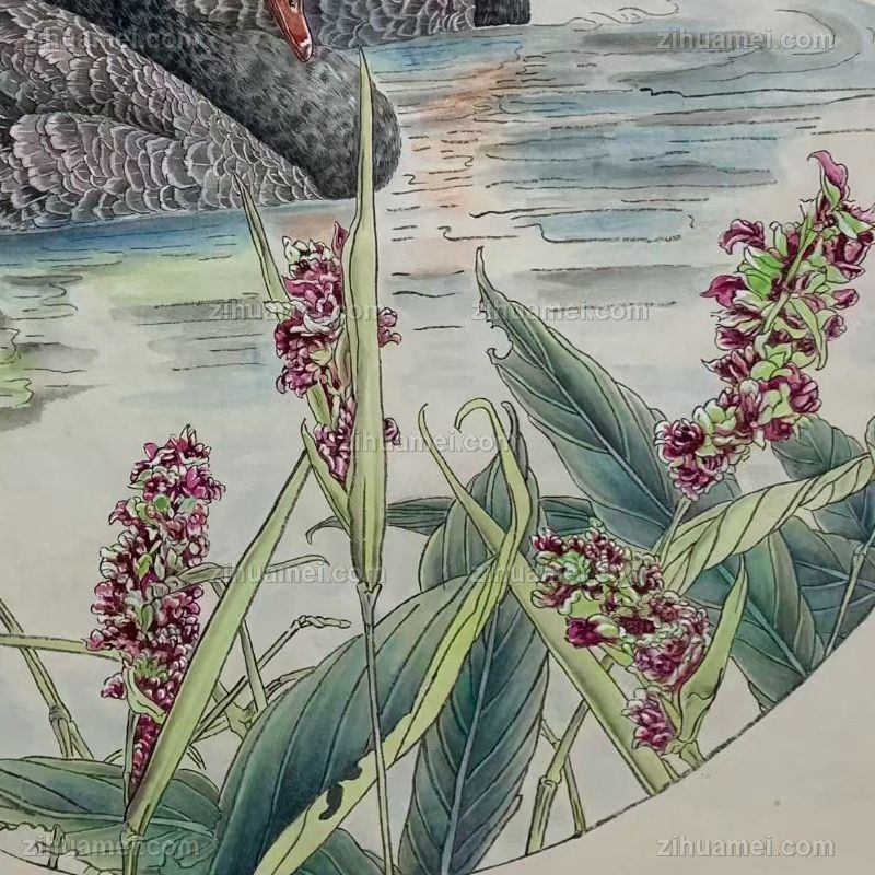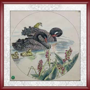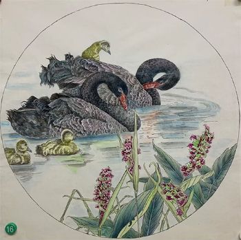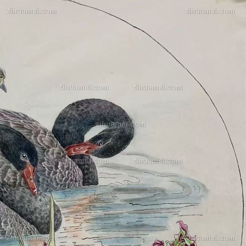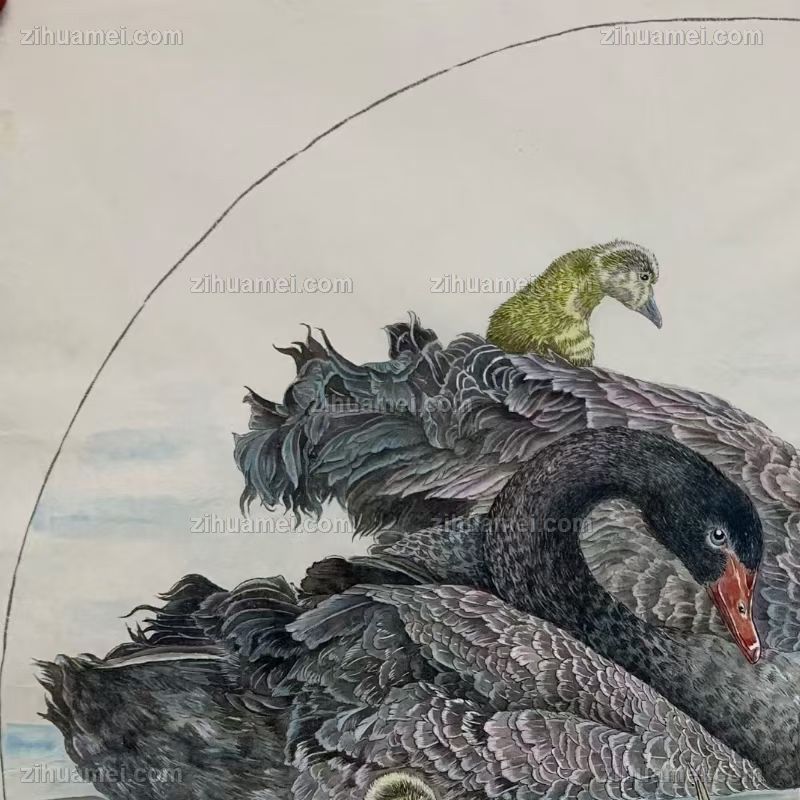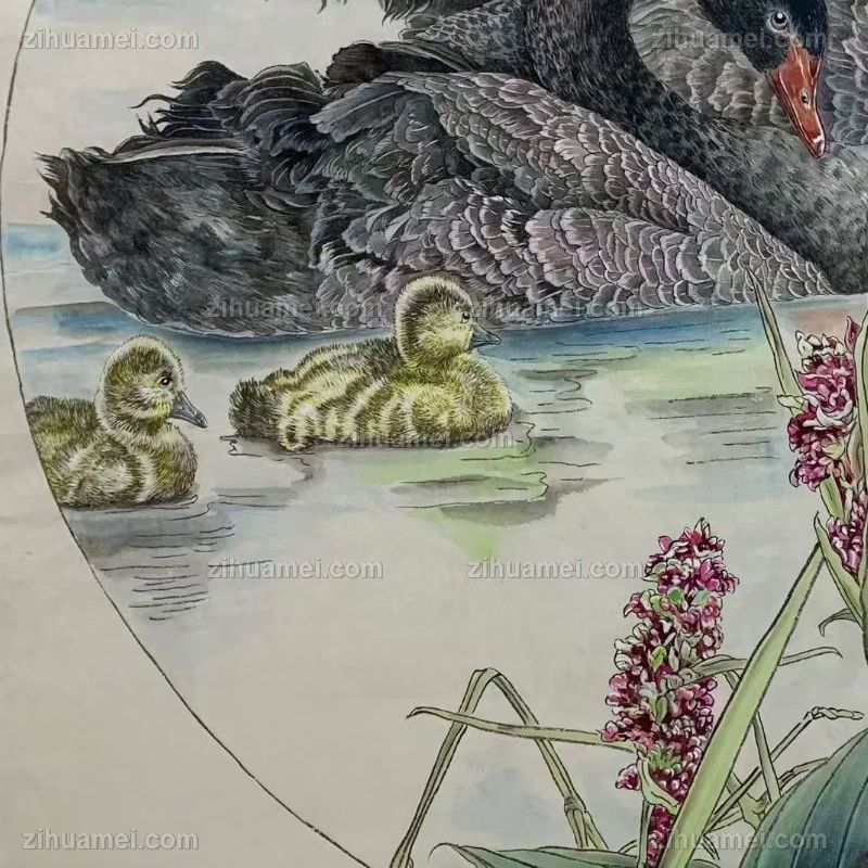 写实工笔黑天鹅一家亲