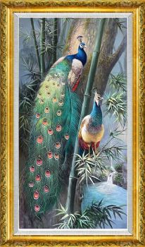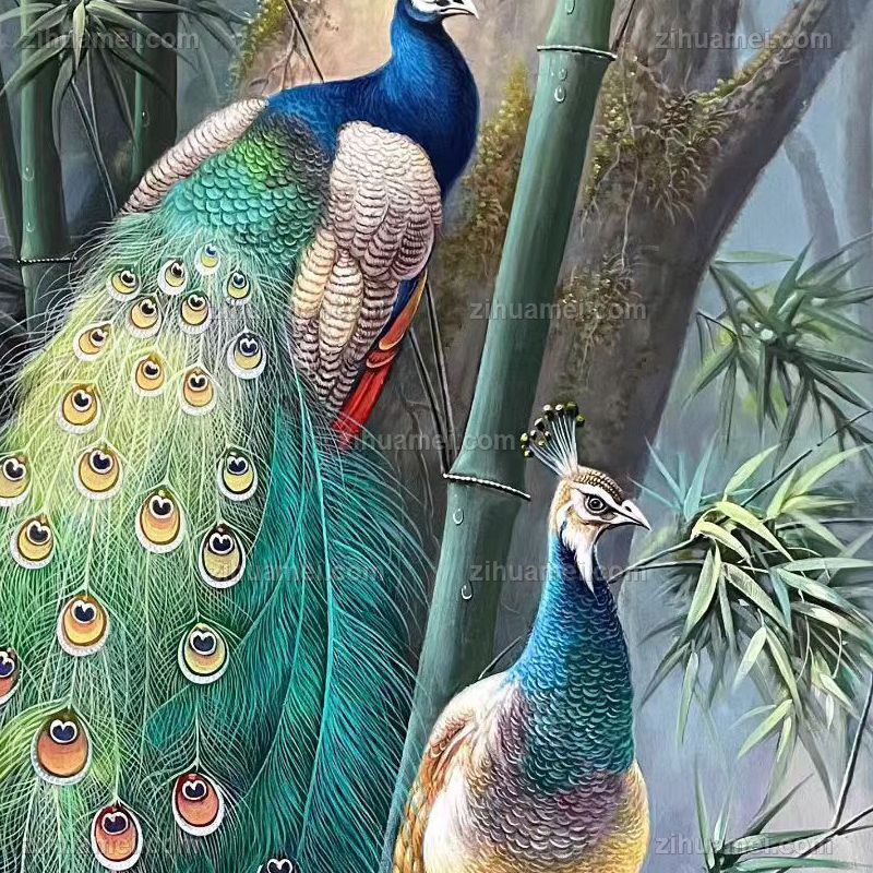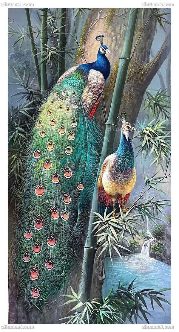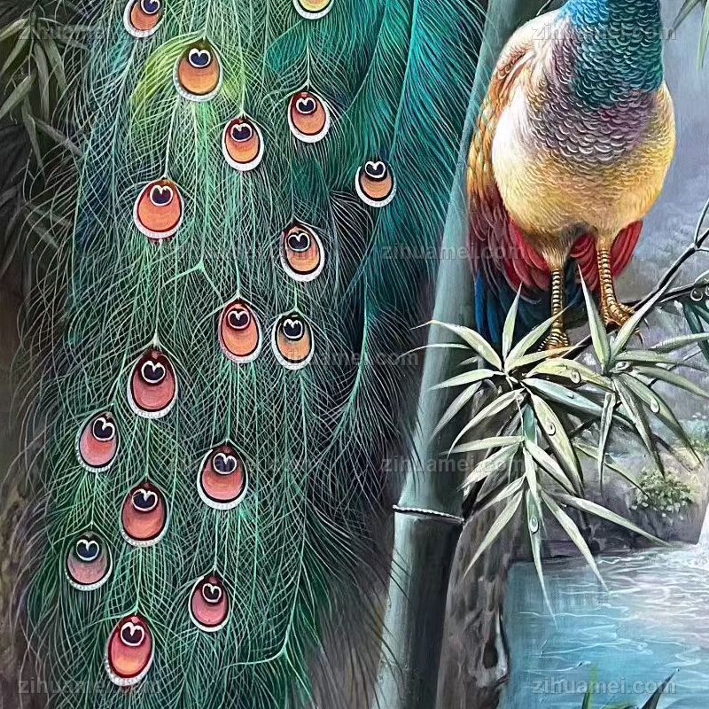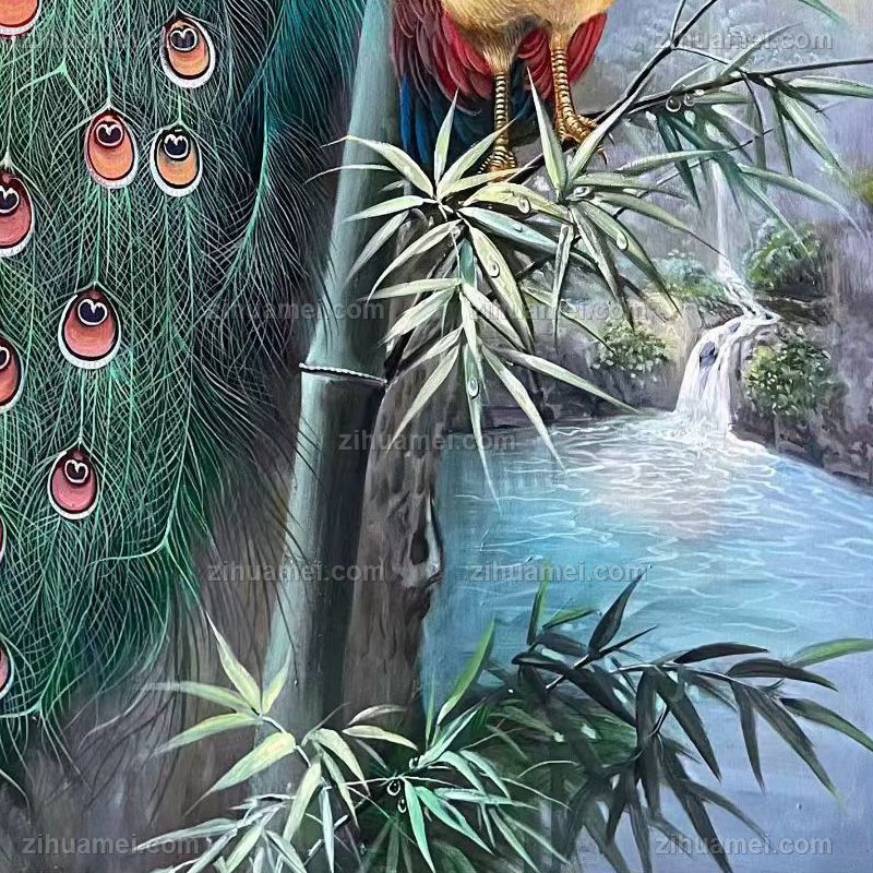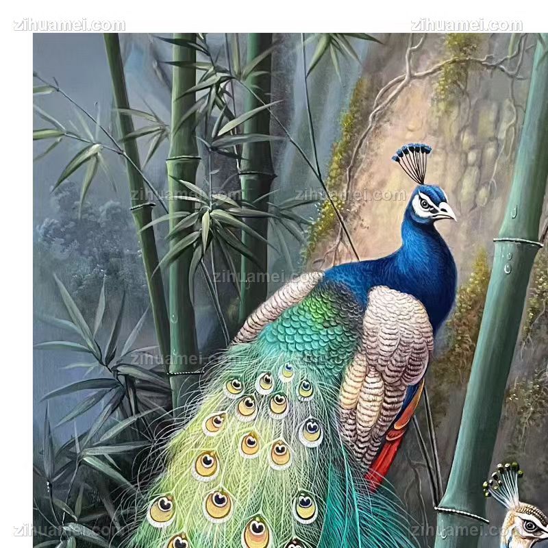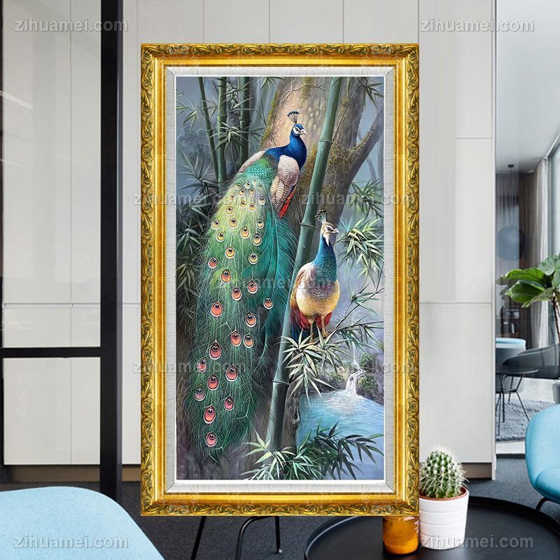 • 竹林孔雀图精品手绘竹子与孔雀油画玄关写实孔雀幸福吉祥实木外框
