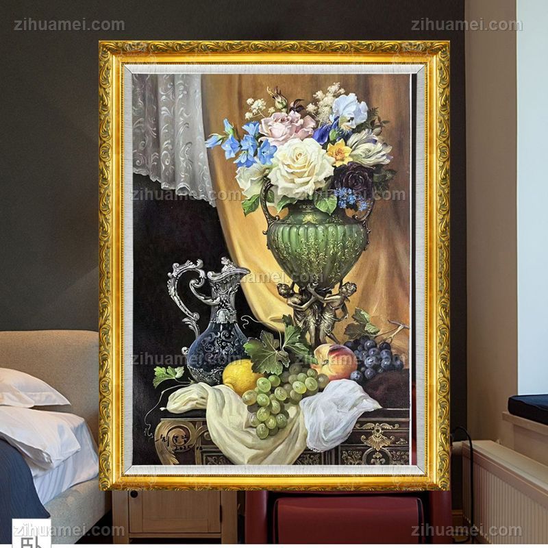 • 精品写实欧式花瓶花卉油画纯手绘油画古典花卉餐厅挂画实木外框