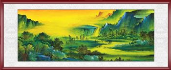 • 彩墨山水国画山里风景山水画小六尺山水画实木外框