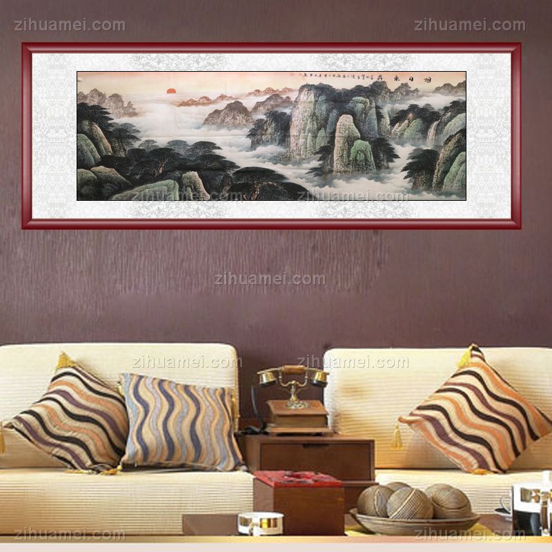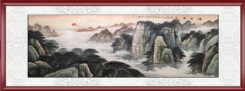 • 手绘 手工 国画 山水画 旭日东升 泰山 日出 典雅红褐实木框