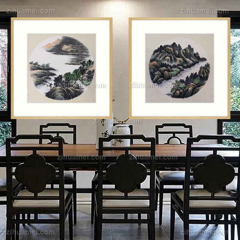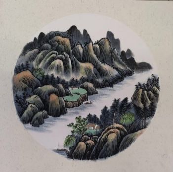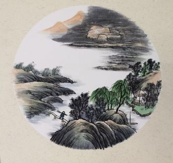 • 圆形山水国画小品画精品仿古卡纸手绘国画适合走廊书房水墨画